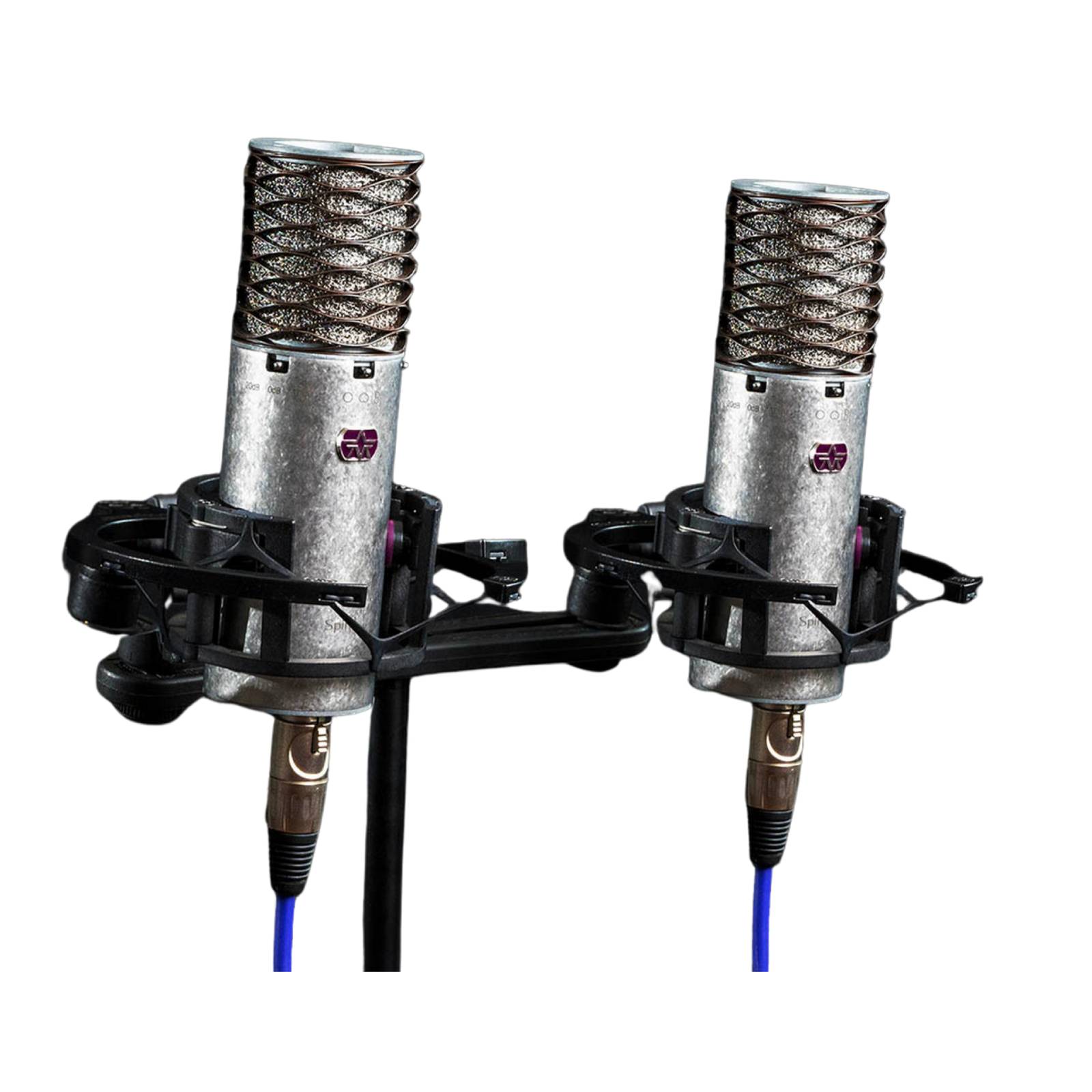 זוג מיקרופונים SPIRIT סטריאו מבית Aston, עם מגני רוח וחנוכיה, להקלטות אולפניות ושידורים ברמה מקצועית. כולל 3 דפוסי קליטה משתנים, סאונד טבעי ומדויק.