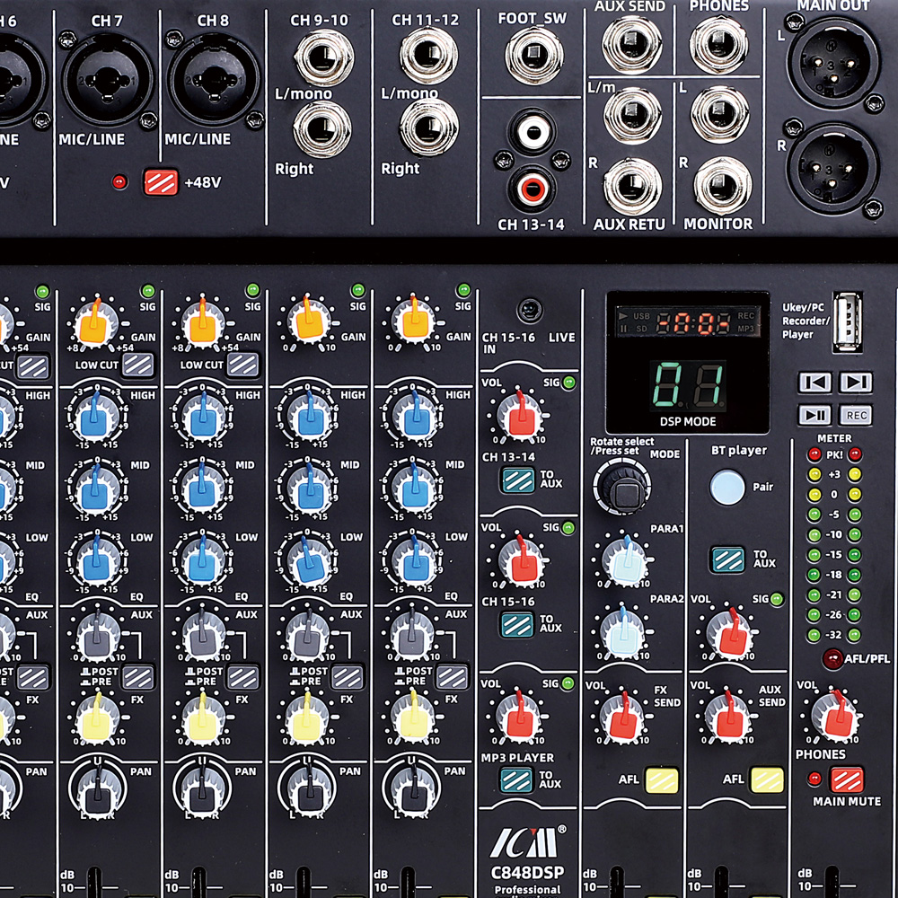 מיקסר 16 ערוצים עם 99 אפקטים DSP, נגן Bluetooth / mp3 ואפשרות הקלטה מחברת יצרן ICM המפורסמת – פתרון מושלם לכל מוסיקאי, זמר, אולפן, חדר חזרות ועוד.