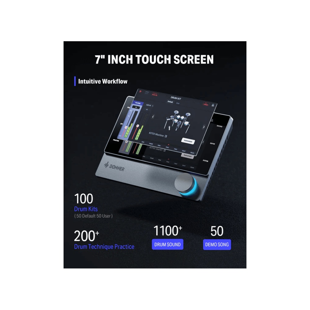 חברת DONNER מביאה לכם את מערכת BACKBEAT EC6878, מערכת תופים חכמה שמשנה את חוקי המשחק עם מסך טאץ’ אינטראקטיבי, תאורת לדים מרהיבה, חיבור USB ושליטה מלאה על חוויית הנגינה.