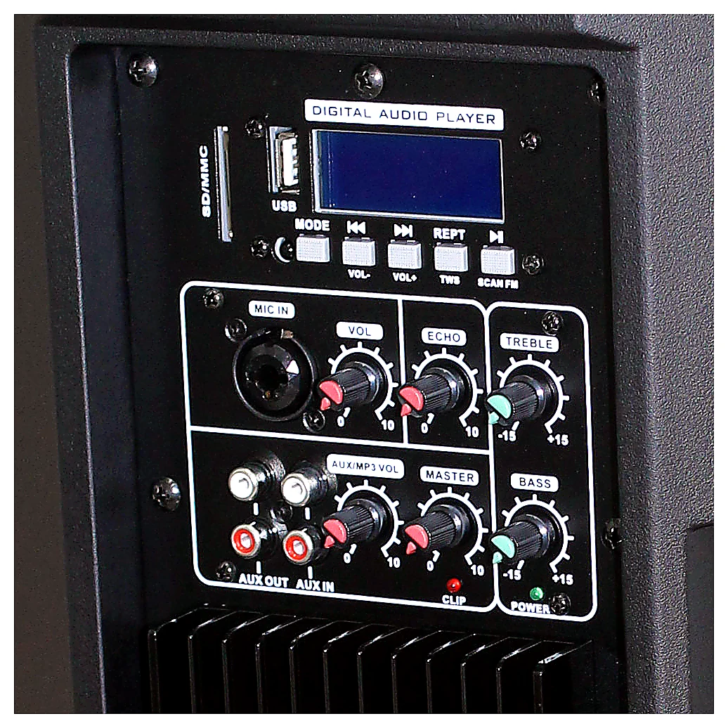 רמקול מוגבר 10″ 150W עם Bluetooth TWS, מיקסר מובנה, נגן MP3 (USB/SD) ואפקט Echo לשירה. מושלם להרצאות, קריוקי והופעות קטנות. כולל כניסת קומבו XLR/6.3, שתי כניסות מיקרופון, RCA In/Out, EQ לבס/טרבל ו-SPL מקס’ 121dB. משקל 10 ק״ג.