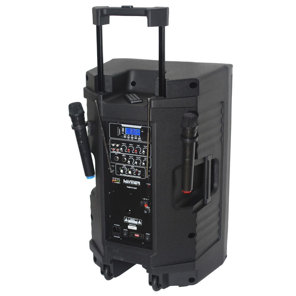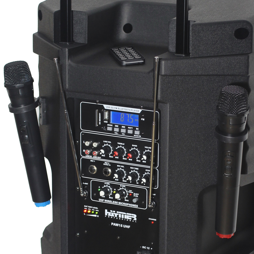 רמקול מוגבר עם סוללה נטענת, נגן mp3, זוג מיקרופונים UHF אלחוטיים מובנים ו Bluetooth
