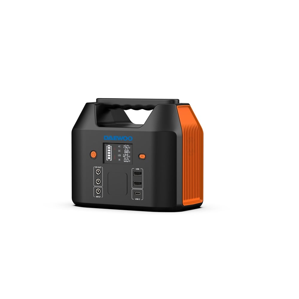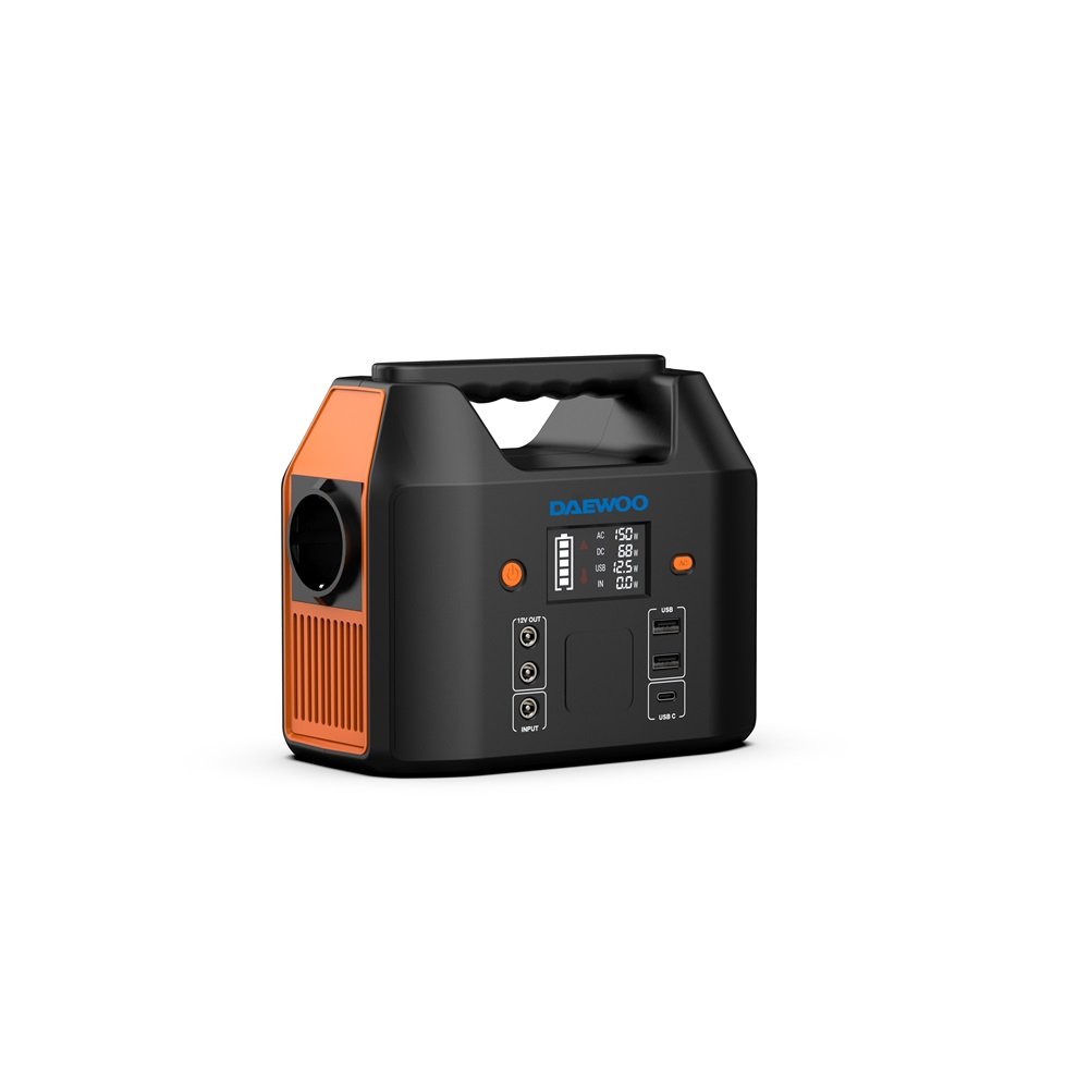 Daewoo DA150 תחנת כוח ניידת עם קיבולת 42,000mAh, טעינה סולארית, הספק 150W, וגיבוי להפסקות חשמל. טעינה מהירה וניידות מושלמת לשימוש בבית ובשטח.