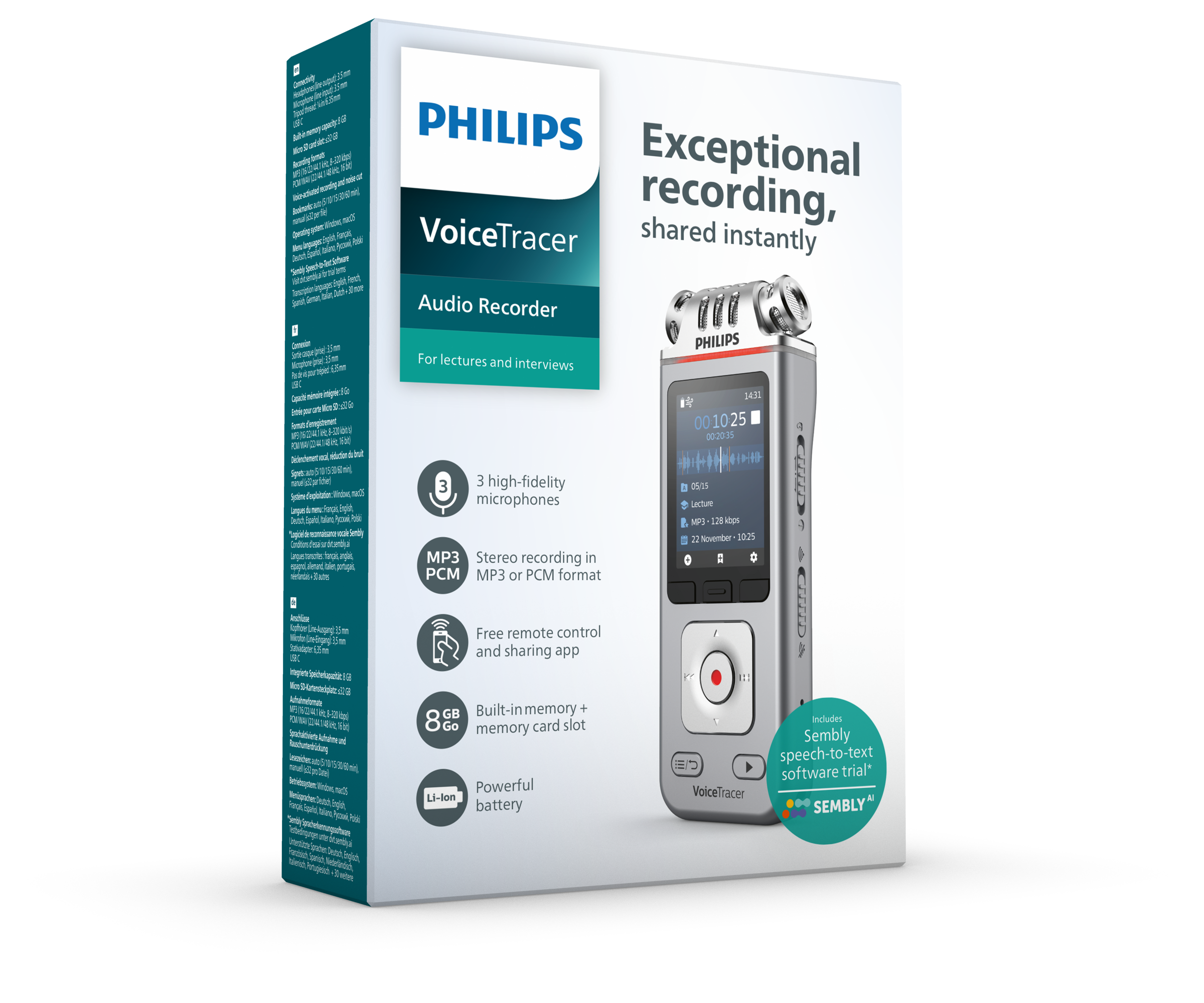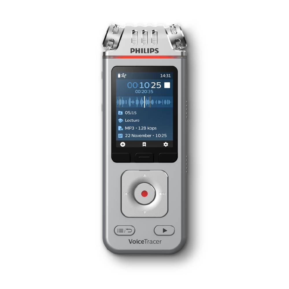 PHILIPS VoiceTracer DVT4110 מקליט אודיו דיגיטלי עם שלושה מיקרופונים באיכות גבוהה, המרת דיבור לטקסט אוטומטית באמצעות תוכנת Sembly, ויכולת שליטה מרחוק דרך אפליקציה. אידיאלי להקלטות מקצועיות ויומיומיות.